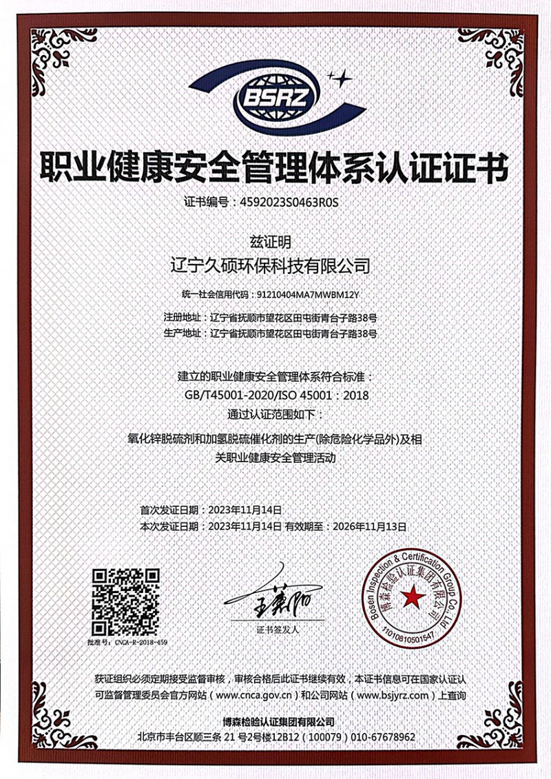 職業(yè)健康安全體系認證證書
