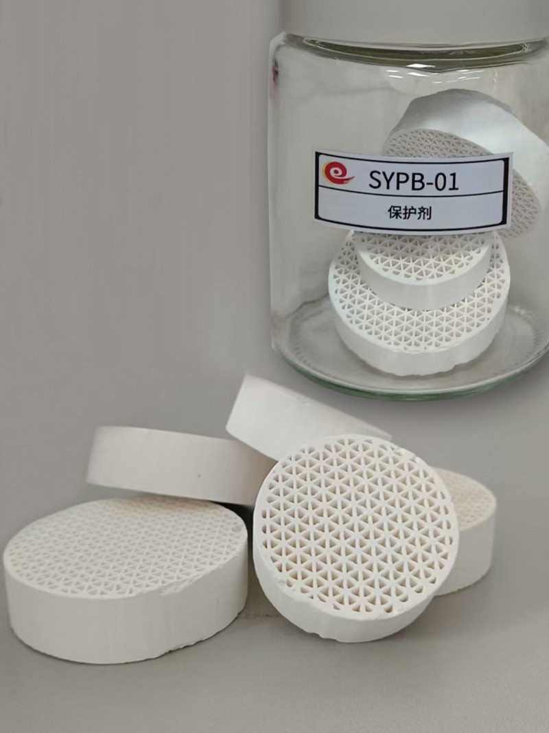 SYPB-01為蜂窩鳥巢結(jié)構(gòu)的保護(hù)劑,具有高空隙率和床層截面流通面積,比瓷球高80%-100%,為降低壓降創(chuàng)造條件。處理含雜質(zhì)原料時(shí)提供優(yōu)異的物料分配和攔截容納雜質(zhì)能力。
