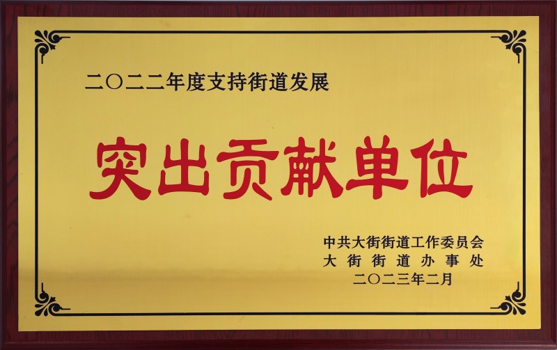 因我司在2022年度的卓越表現(xiàn),中共大街街道工作委員會特此頒發(fā)“突出貢獻單位”以茲鼓勵!